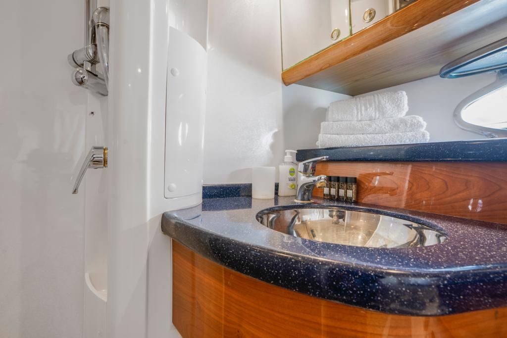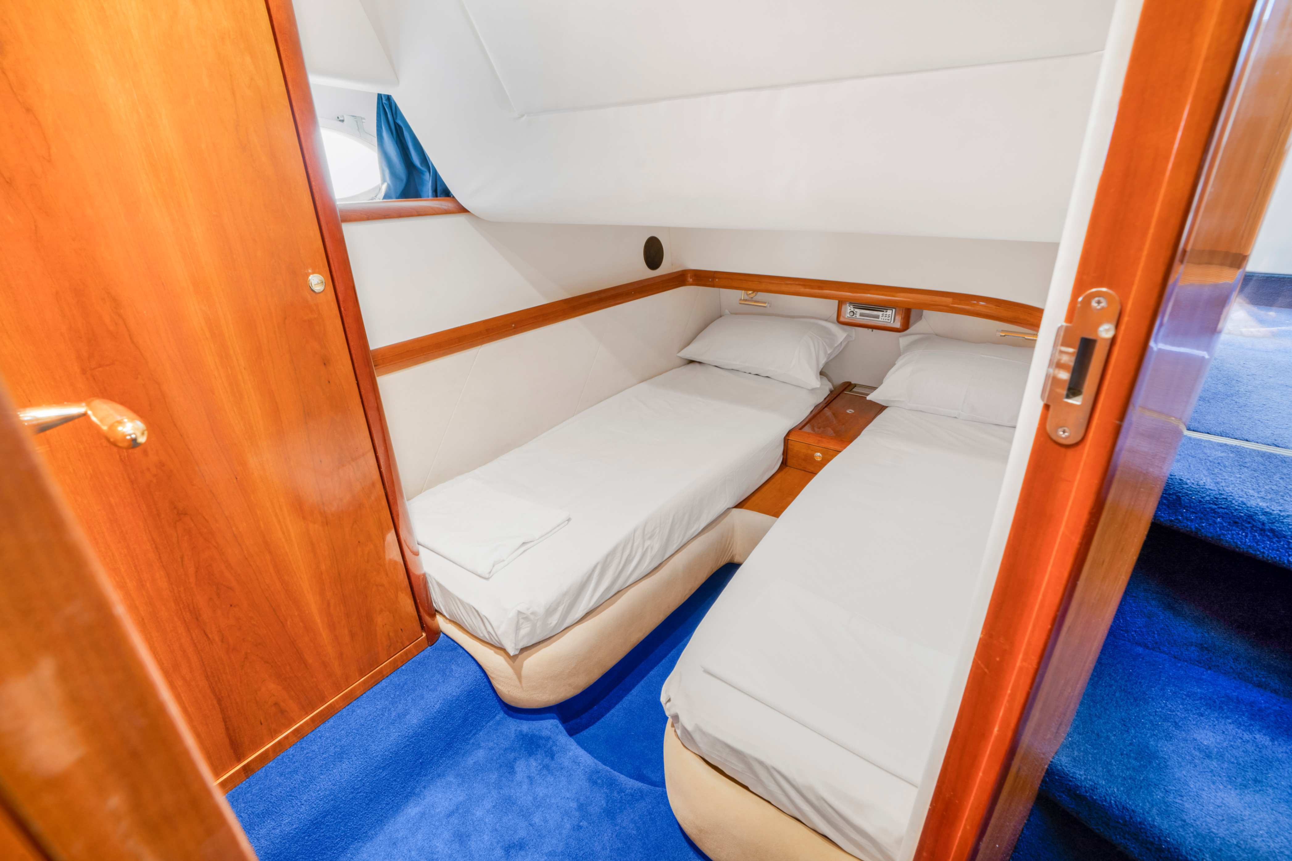 The yacht accommodates overnight 6 guests in her three cabins; a master cabin that offers a glorious queen size bed, a guest cabin with a double bed and another guest cabin with two single beds. All cabins have air-condition.